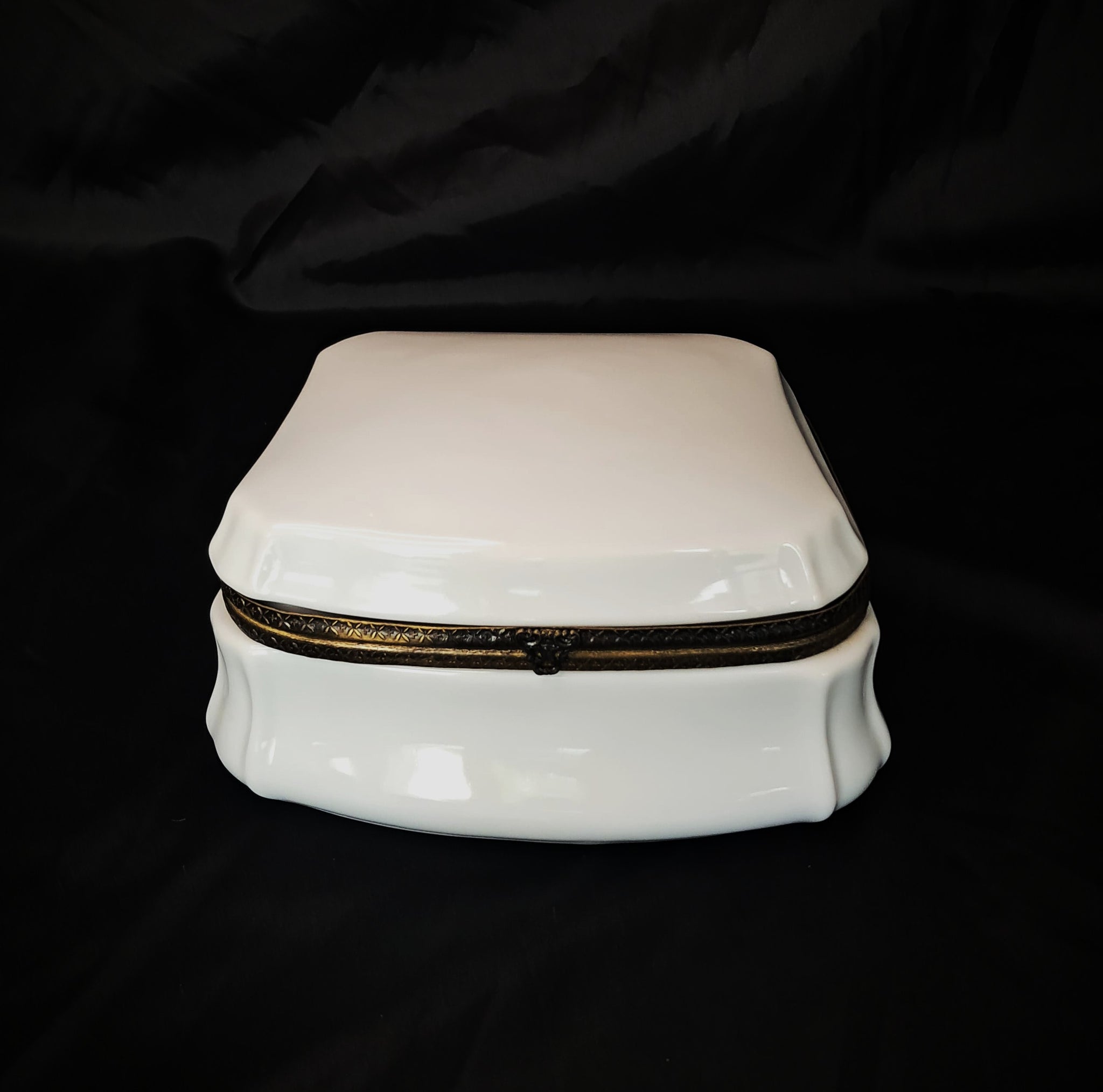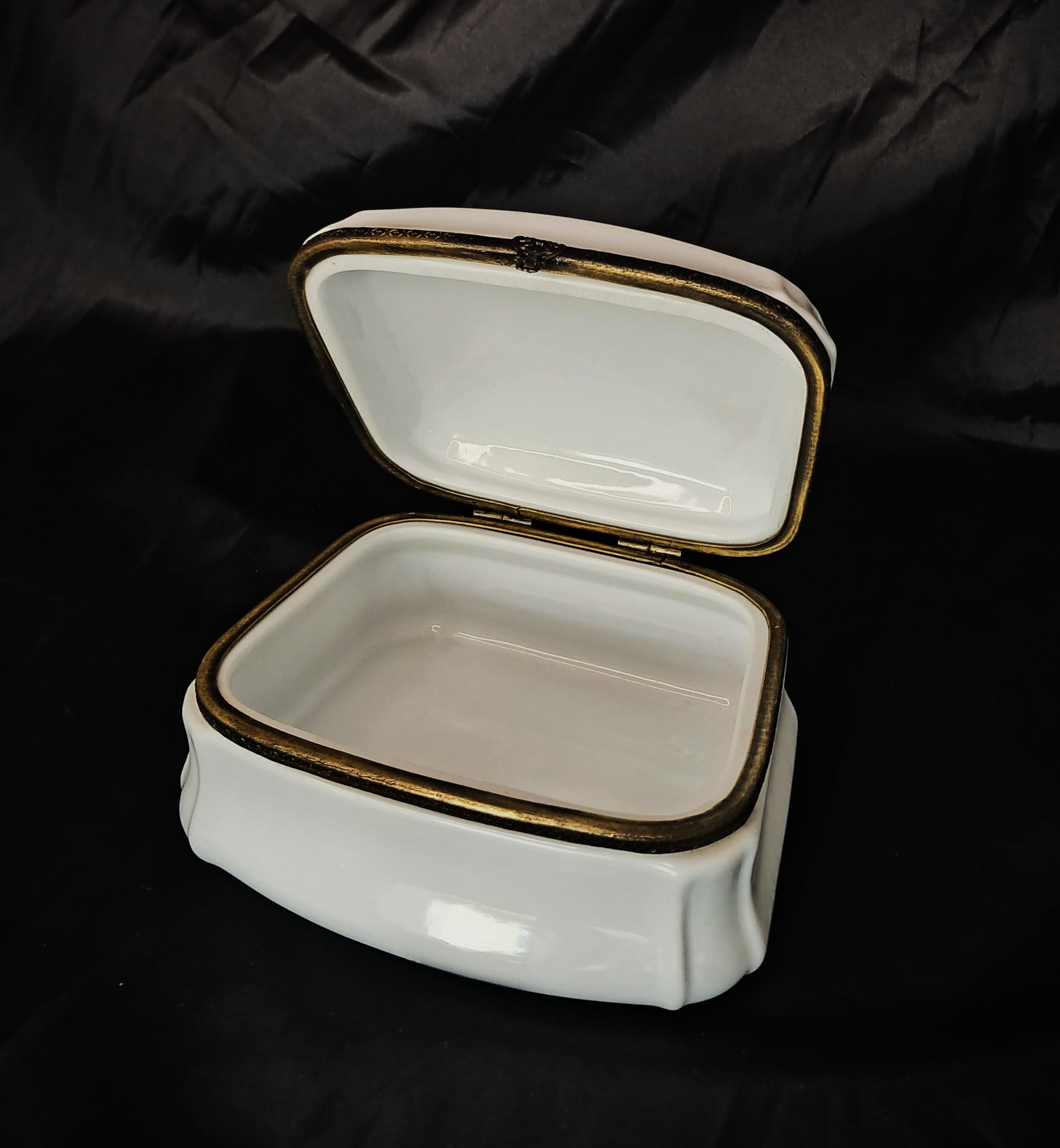 - Caixa decorativa em porcelana vidrada, ideal para guardar pequenos objetos ou ser usada como peça ornamental.